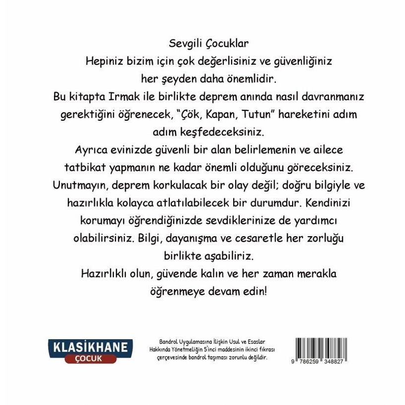 Depreme Hazırlıklı Ol! Kitabında çocuklar, Irmak ile birlikte deprem anında nasıl davranmaları gerektiğini öğreniyor. Hikâye boyunca “Çök, Kapan, Tutun” hareketi adım adım anlatılıyor ve deprem sırasında doğru davranışın önemi sade bir dille aktarılıyor.